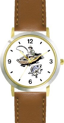 Young Fisherman or Man in Boat With Fish on Line Fishing - WATCHBUDDY® DELUXE TWO-TONE THEME WATCH - Arabic Numbers - Brown Leather Strap-Women's Size-Small Review