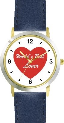 Red Heart - World's Best Lover - Love & Friendship Theme - WATCHBUDDY® DELUXE TWO-TONE THEME WATCH - Arabic Numbers - Blue Leather Strap-Women's Size-Small Review