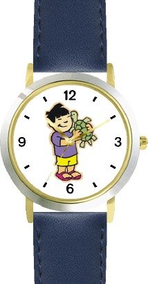 Boy Holding Turtle or Tortoise Animal - WATCHBUDDY® DELUXE TWO-TONE THEME WATCH - Arabic Numbers - Blue Leather Strap-Women's Size-Small Review