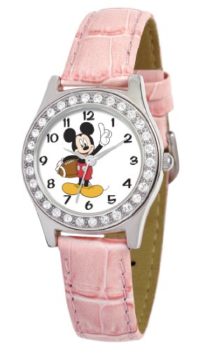 A pink, embossed-leather band and a sparkling, rhinestone-studded metal bezel add pretty points to the Disney Women's Queen Collection Mickey Mouse Pink Leather Strap Watch. A white dial offers black, Arabic numeral hour indicators that surround a colorful graphic of Mickey Mouse clutching a football. Silver-tone hands round out this whimsical yet polished timepiece. Presented in a sturdy, signature Disney gift case, this watch is water resistant to 99 feet (30 M).