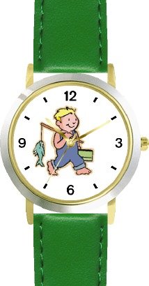 Young Boy Fishing or Fisherman with Fish on Fishing Pole Fishing - WATCHBUDDY® DELUXE TWO-TONE THEME WATCH - Arabic Numbers - Green Leather Strap-Women's Size-Small Review
