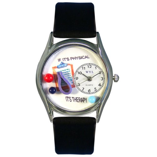 If you have a physical therapist in your life, then the Whimsical Watches Women's Physical Therapist Black Leather Watch #S0610006 is just what you're looking for. This fun and fanciful timepiece features a colorful physical therapist-themed scene alongside a circular white time display with gold-tone hands and Arabic numerals. Precise, high-quality Japanese quartz movement ensures time-keeping reliability, while the black leather band offers a secure, comfortable fit. A stainless steel bezel surrounds the 35-millimeter case and rounds out the details of a watch that every physical therapist is sure to love. This whimsical watch is water resistant to 100 feet (30 meters).